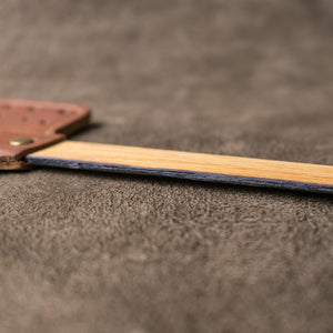 The handle is crafted using the head of a Tennessee Whiskey Barrel right from Lynchburg, TN. In fact, on one side of the handle, you can see the charred inside of the barrel. We use our own American Tanned Leather to give the perfect finish to this beauty.