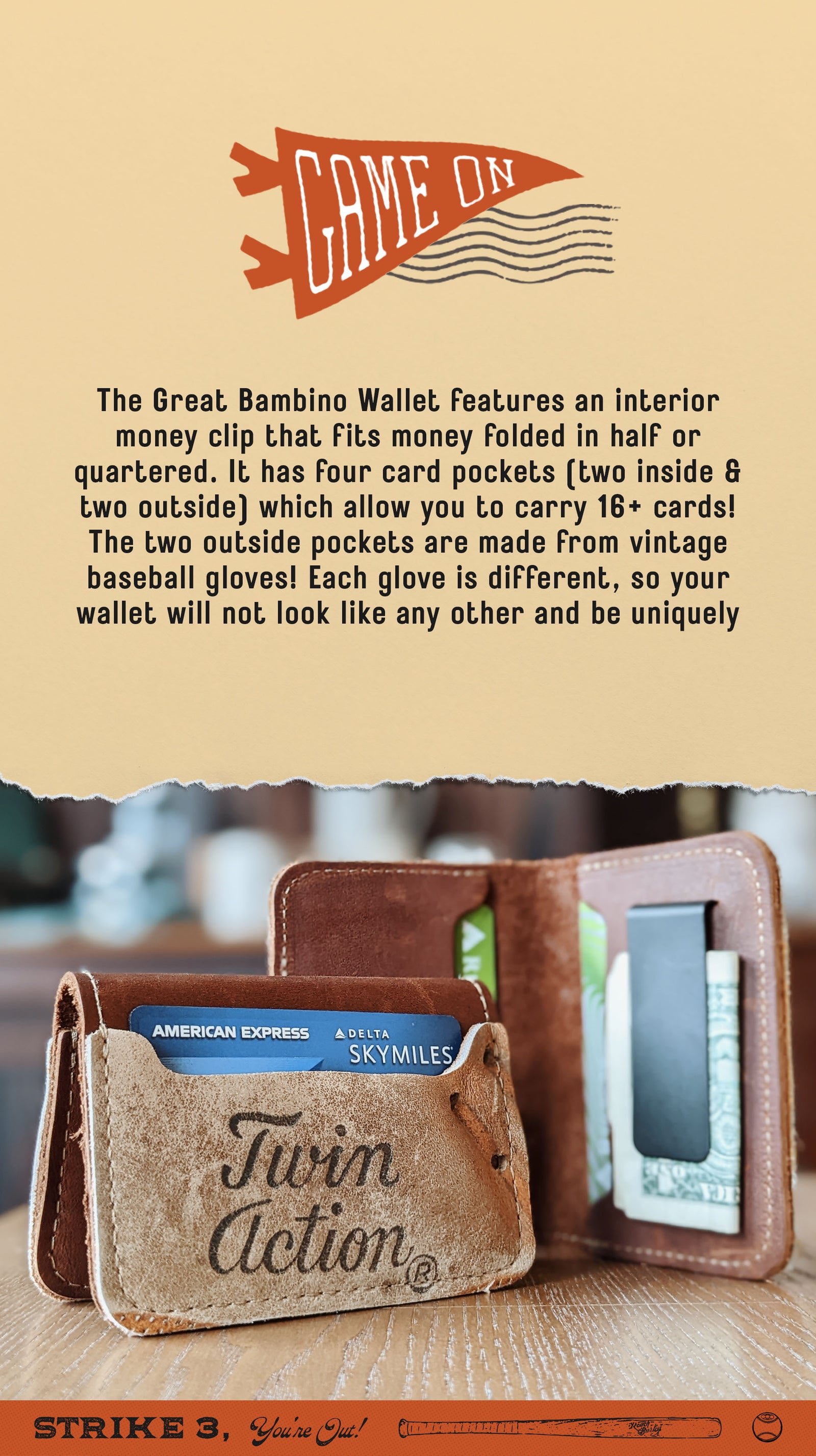 This wallet is handmade right here in our Huntsville, Alabama shop with a blend of Vintage Baseball Gloves & Full Grain American Steer Hide.