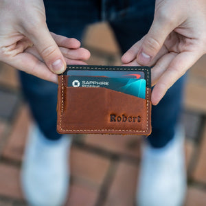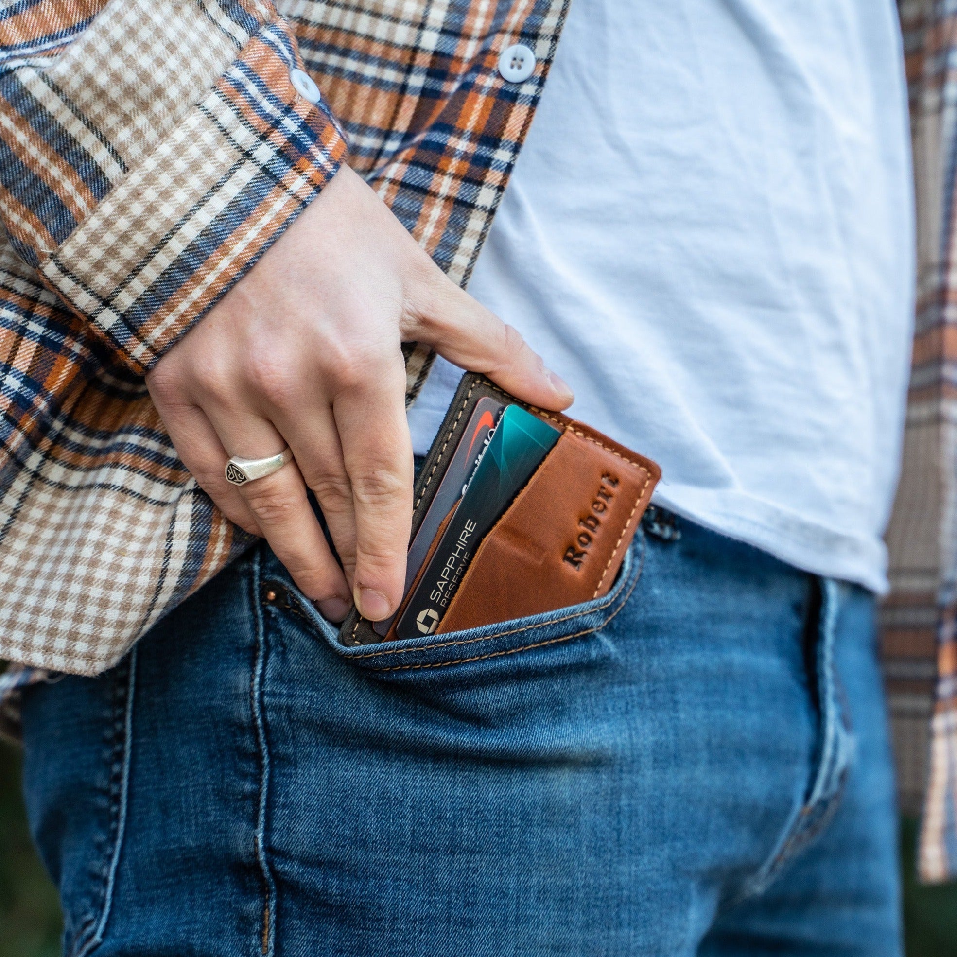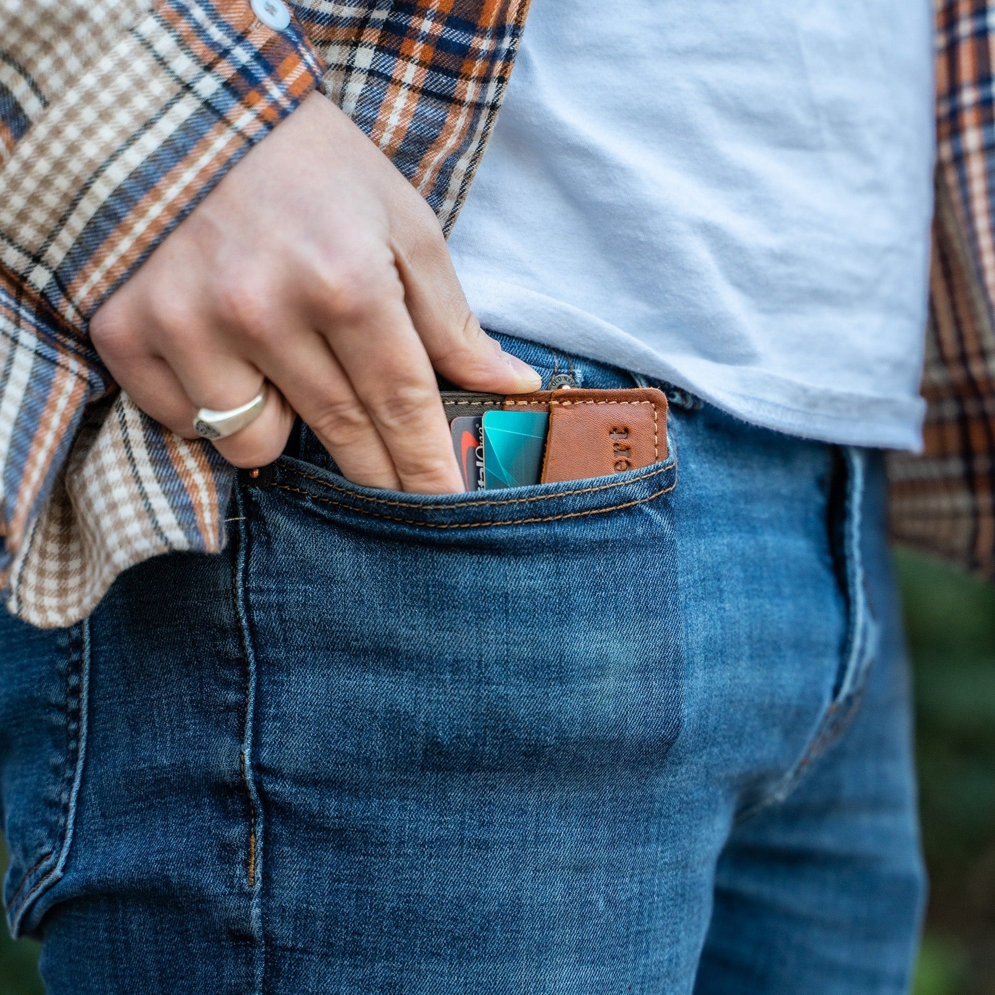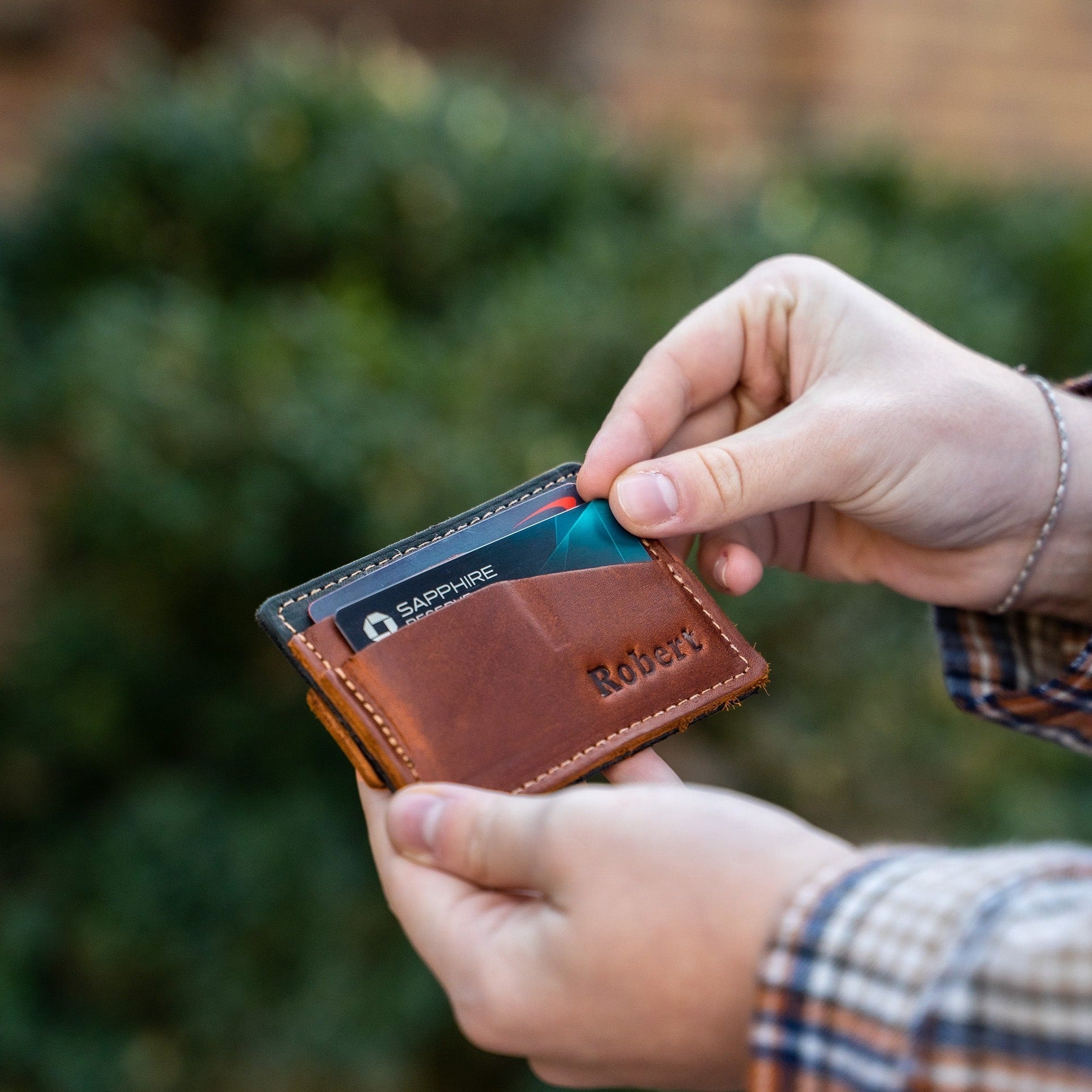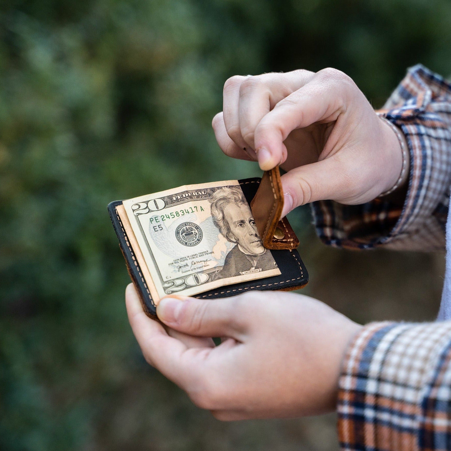 Meet The Levi Wallet. It's small but mighty and it comes in a horizontal style. Secure cash and cards with three pockets and a magnetic money clip.