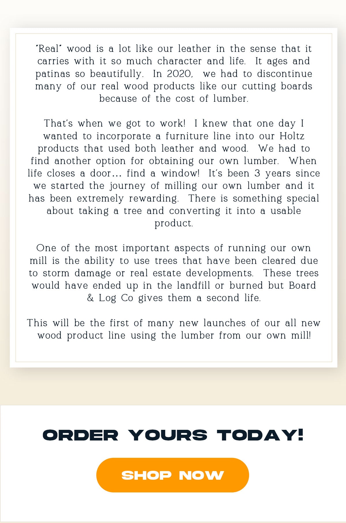 Running our own mill allows us to use trees that have been cleared due to storm damage or real estate developments. These trees would have ended up in the landfill or burned, but Board & Log Co gives them a second life.
