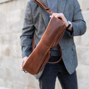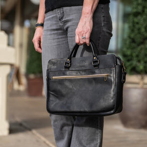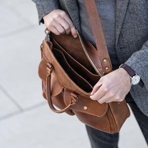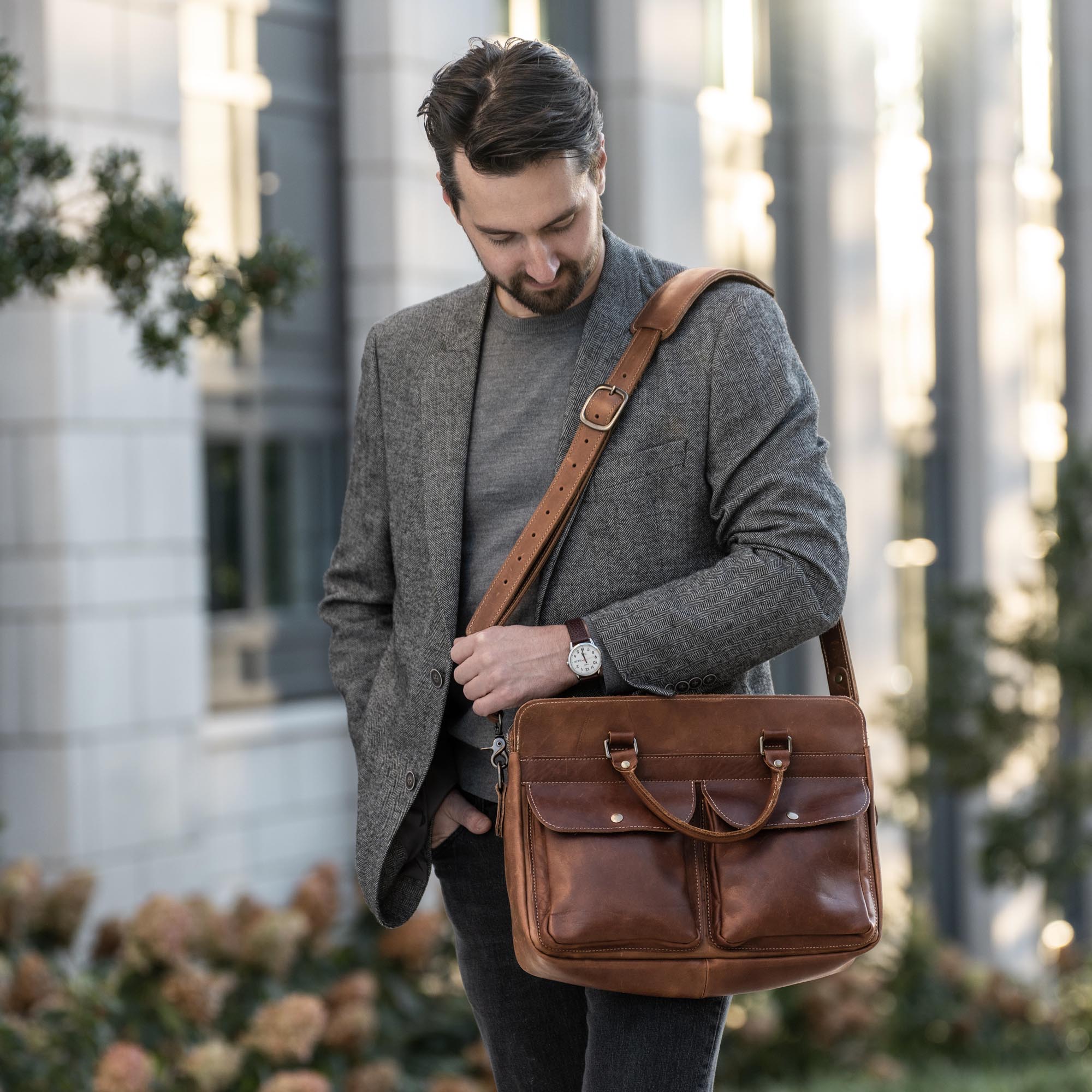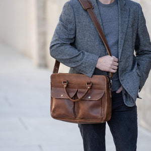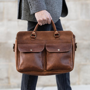 Built for the modern professional, the Fine Leather Professional Laptop Bag is hand-stitched from full grain leather and designed to carry everything you need with understated sophistication. Two front pockets with brass snaps keep your quick-access gear secure. On the back, a zippered pocket and hidden double-snap compartment hold documents or a tablet. Inside, two dividers create three organized sections for your laptop, notebooks, and daily tools. Finished with a detachable shoulder strap, this briefcase balances heritage craftsmanship with modern functionality — a companion built to age beautifully.