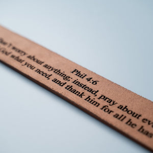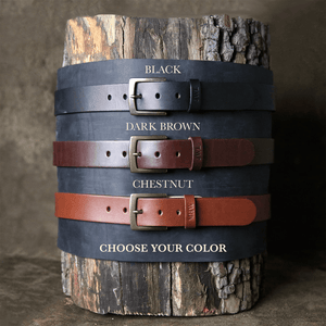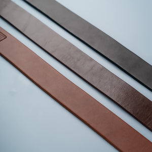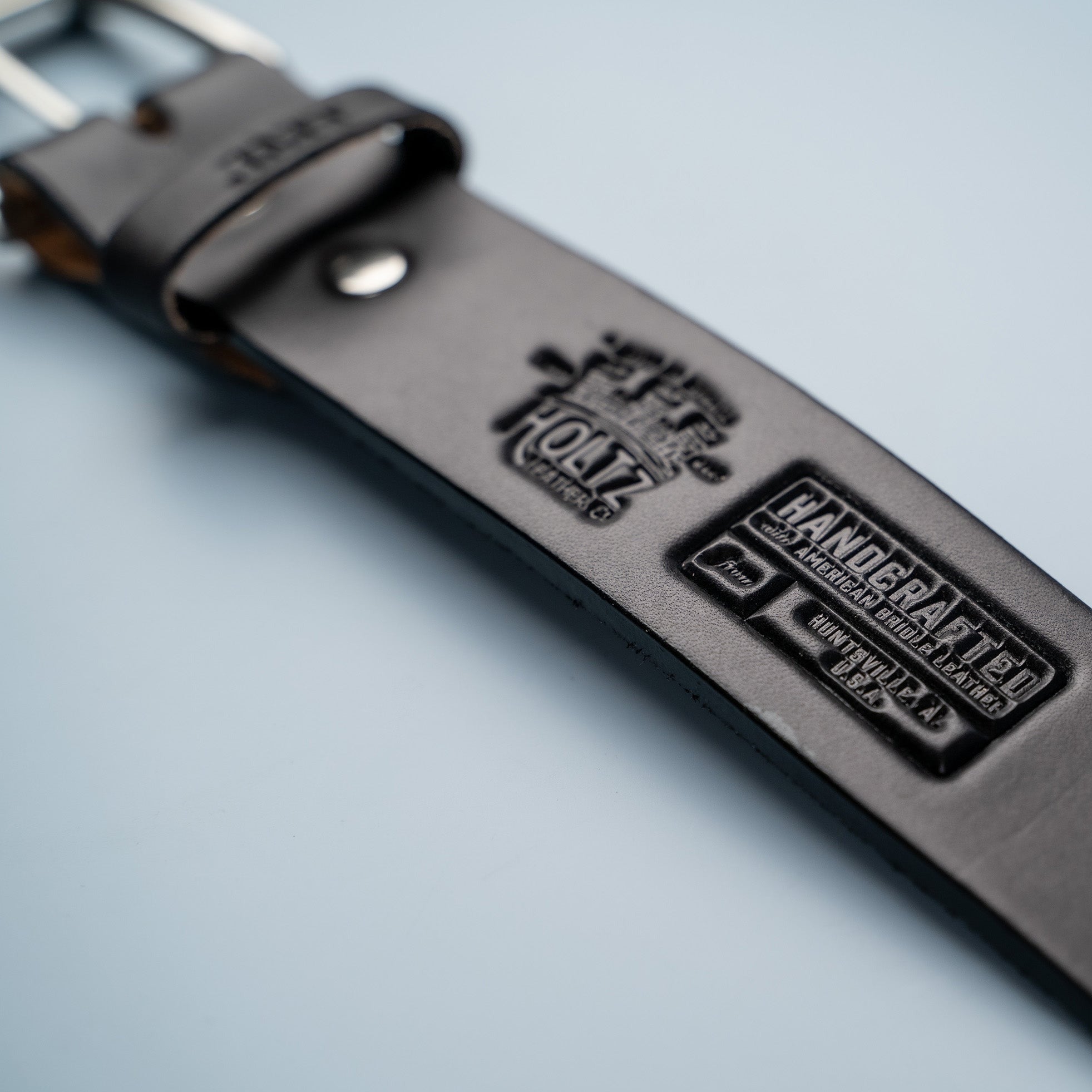 Our Men's Casual Belts can be personalized with initials on the belt holder as well as a secret message on the inside (for a personal touch!). These strong, durable belts are made from Full Grain American Steerhides and finished off with an edge coat and square nickel or brass hardware.