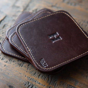The ranch house: a classic, homey, and easygoing place. These Full Grain American Leather coasters match that look and feel, making your house a home. This set comes with four coasters, available in black, chestnut, or dark brown. Add an initial to make them even more unique and special!