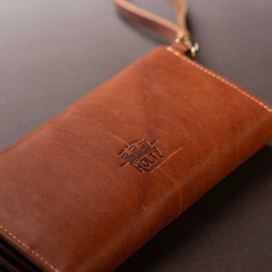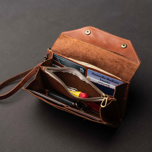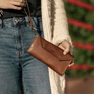 We designed this clutch to fit comfortably in your hand, and for a hands free carry we've added a handy leather wrist strap! The clutch features eight card pockets, a zipper pouch and a cash pocket, so there's plenty of space for your cards, cash and accessories. Whether you’re running errands or heading to an evening out, The Jackie O is your perfect companion—refined, practical, and effortlessly stylish.