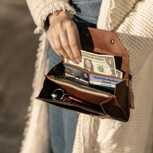 The Jackie O Clutch is made right here in our shop with the finest of Full Grain American leathers. We hand-pick our leather hides from a local tannery for a rustic look and feel. This gift will be used and loved for a lifetime!