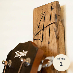 Our very first personalized guitar hanger! Made from the same repurposed Jack Daniel's Whiskey Barrels, this guitar hanger boasts a custom touch while maintaining a sleek footprint.