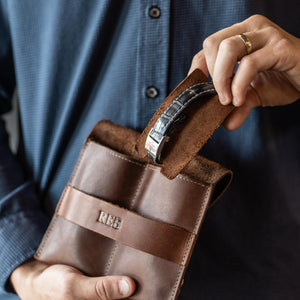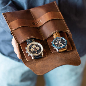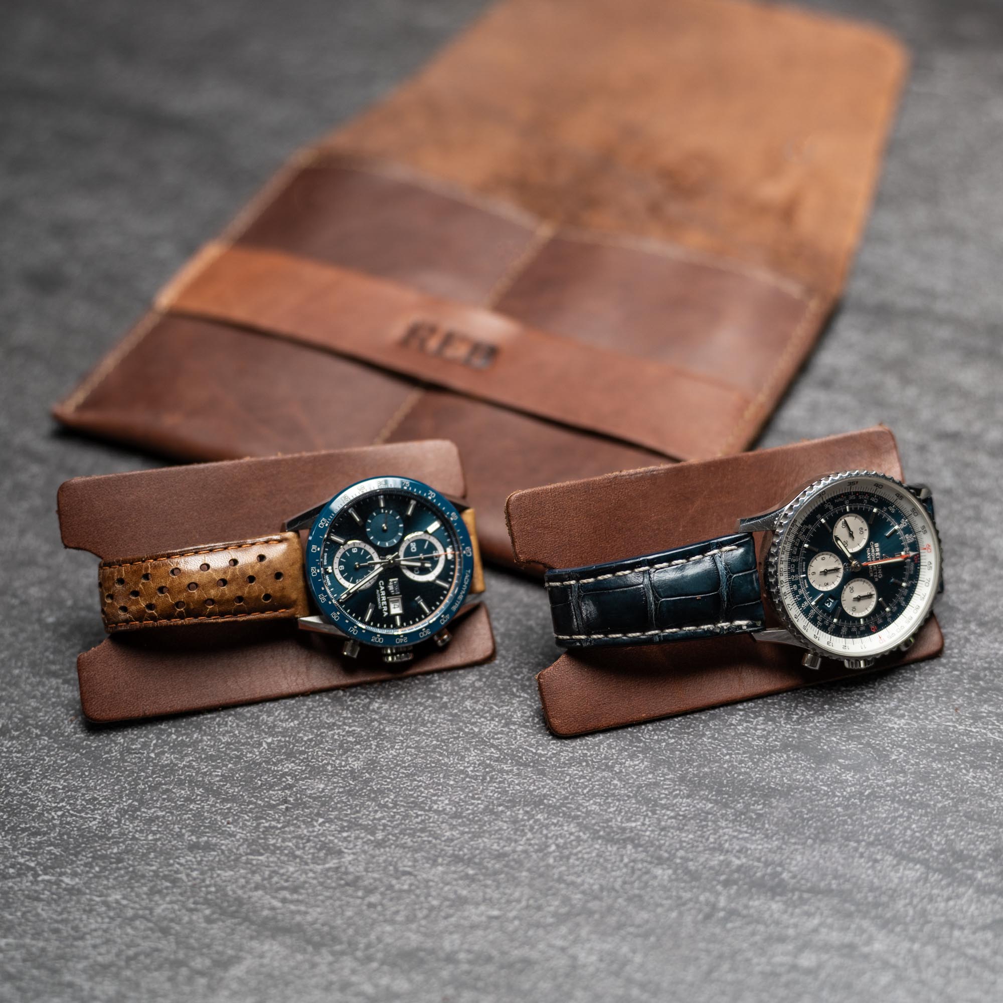 Meet the Meridian - a Personalized Fine Leather Watch Holder that is built to hold two watches and keep them secure. We added velour lining to protect the front glass elements as well as ticket shaped inserts to protect the watch underbelly.