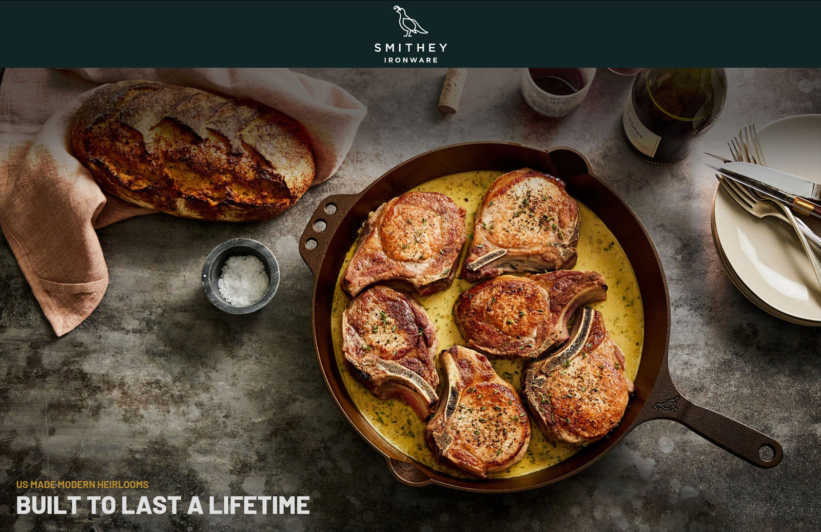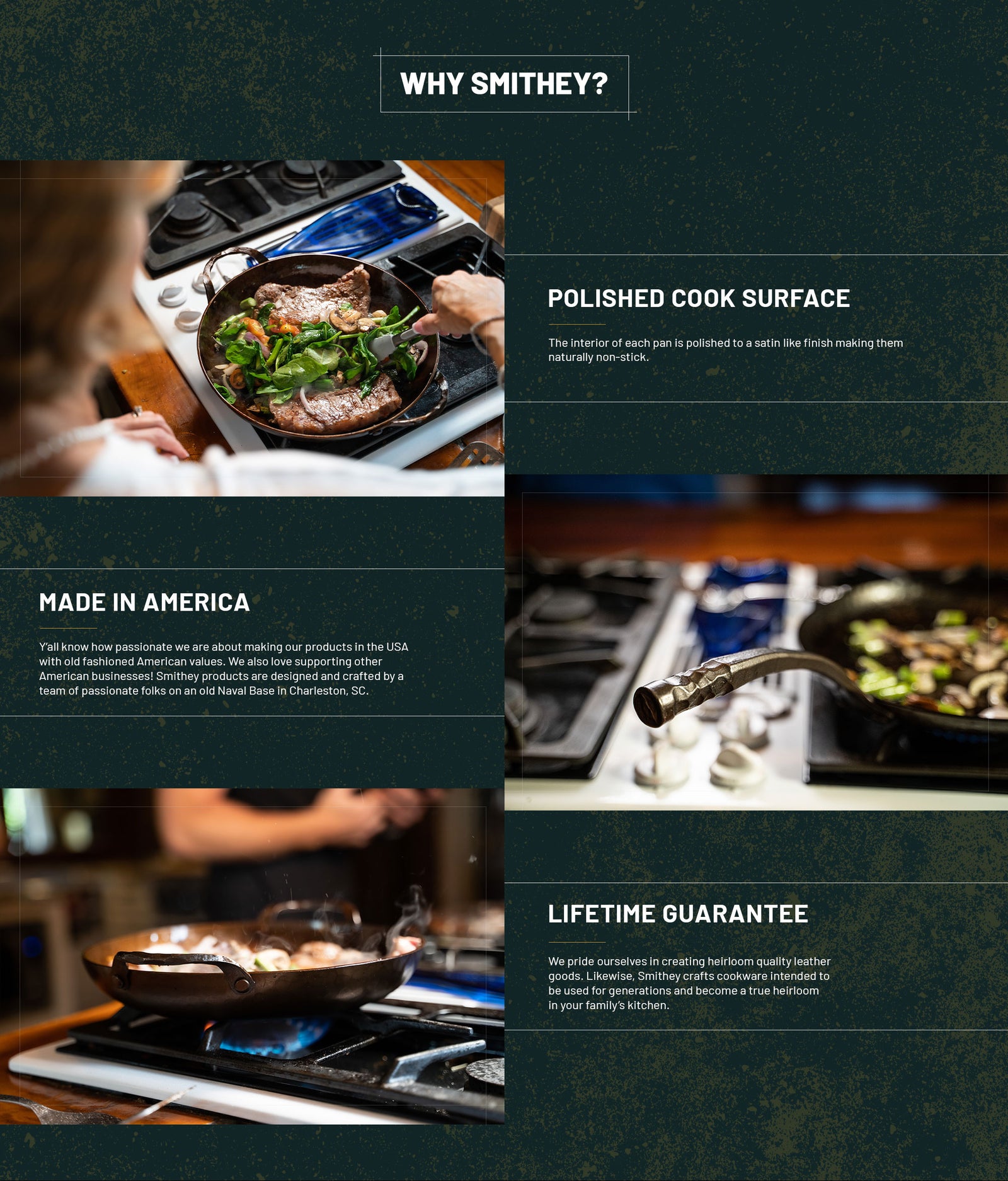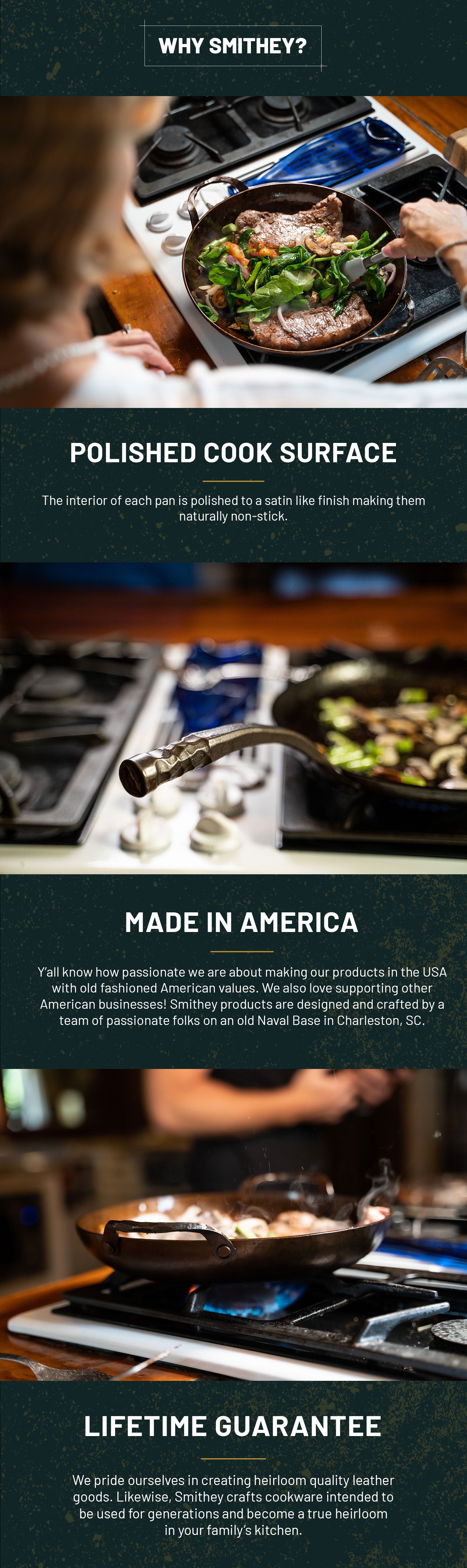 We are proud of what we make. We design and craft our cookware in the USA, and our talented team of craftsmen and women individually inspects every Smithey multiple times throughout the manufacturing process. We guarantee the quality of every Smithey for life. We intend for your Smithey to become a cherished possession, and we are here to support you in your cooking journey. Use it well.