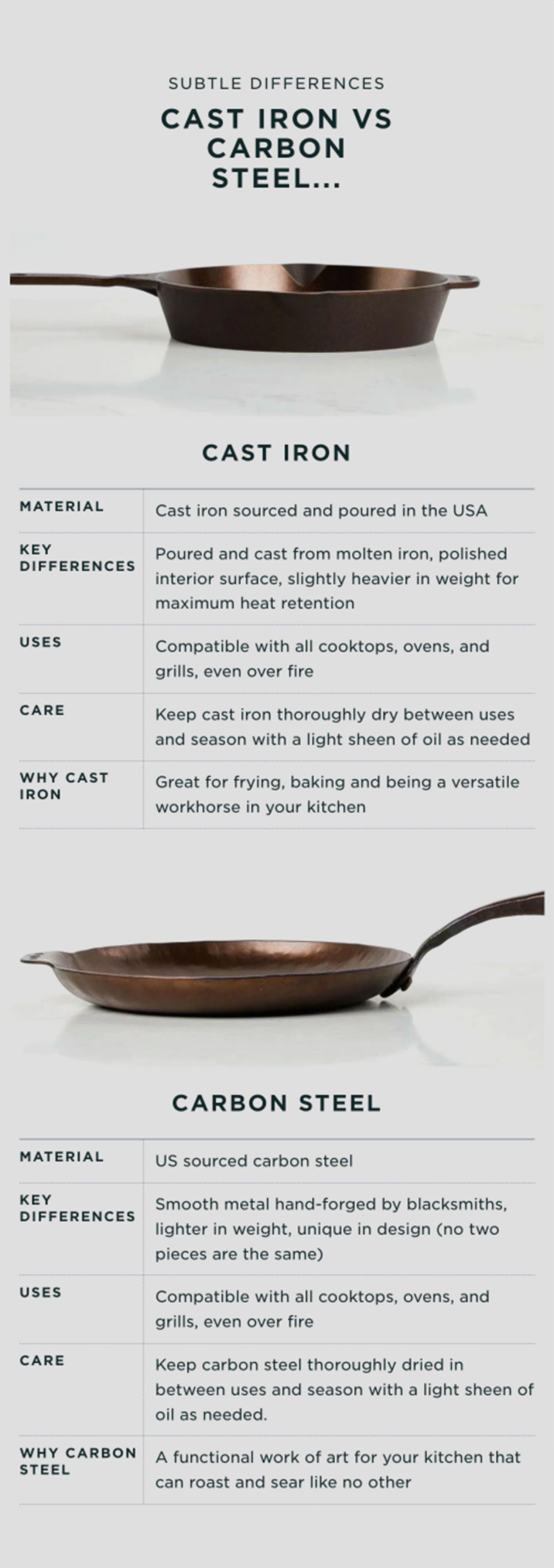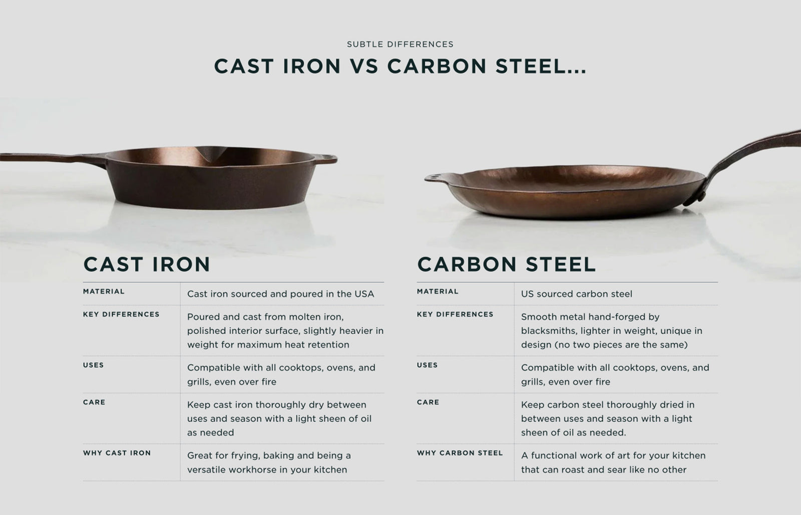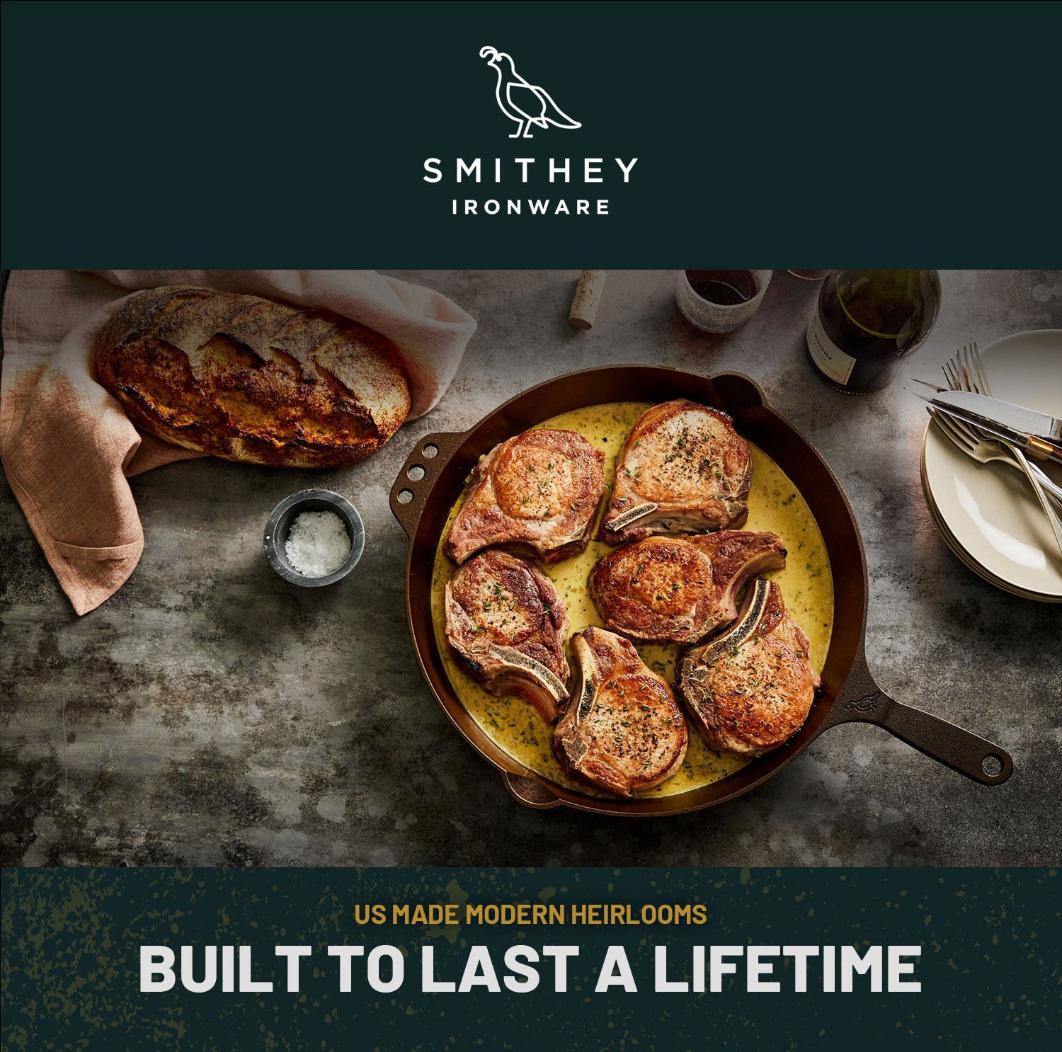We are proud of what we make. We design and craft our cookware in the USA, and our talented team of craftsmen and women individually inspects every Smithey multiple times throughout the manufacturing process. We guarantee the quality of every Smithey for life. We intend for your Smithey to become a cherished possession, and we are here to support you in your cooking journey. Use it well.