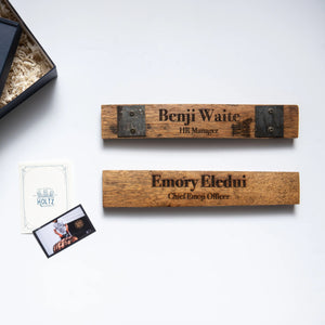 Adorn your employee's desks with a one of kind name plate made from Tennessee Whiskey Barrels! We can take your logo, their name and title, and laser engrave our plates to create a memorable and practical gift for the office!