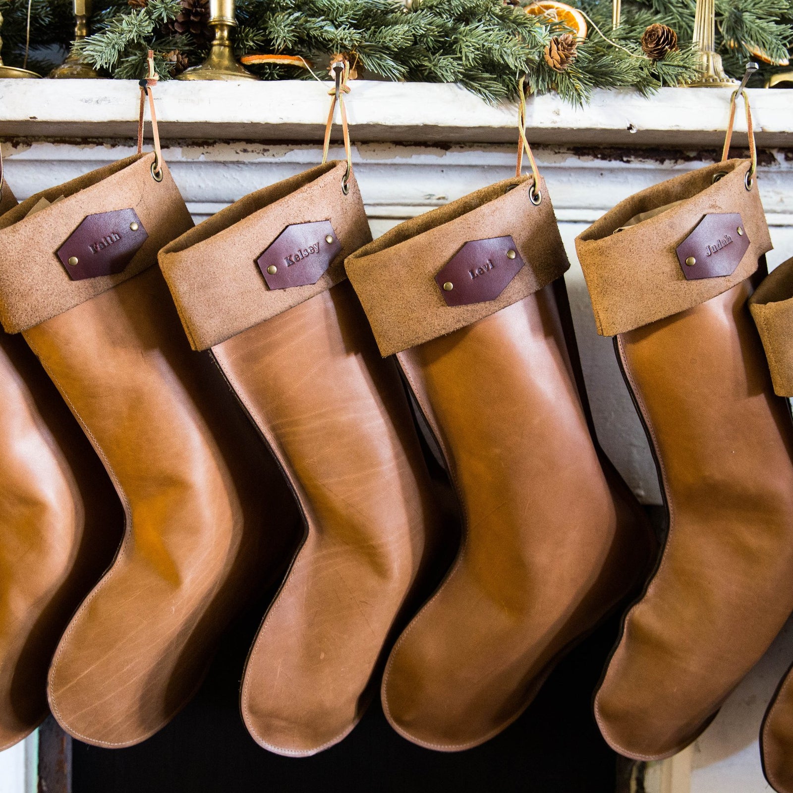 Our full grain leather stockings are thoughtfully handcrafted. They come in tan or brown leather, and don't fall apart like the ones from the dollar store! The leather will develop a quality patina and only grow more beautiful with age.