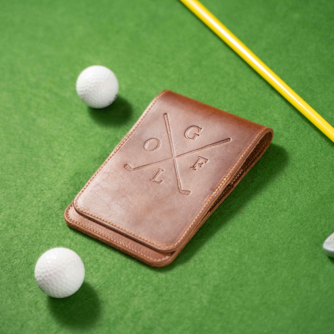 FORE! Hit the green with our fine leather Golf Score Card Holder to keep track of all your birdies and bogies. Made of fine, full grain, American leather this score card holder will fit perfectly in your golf bag or back pocket!