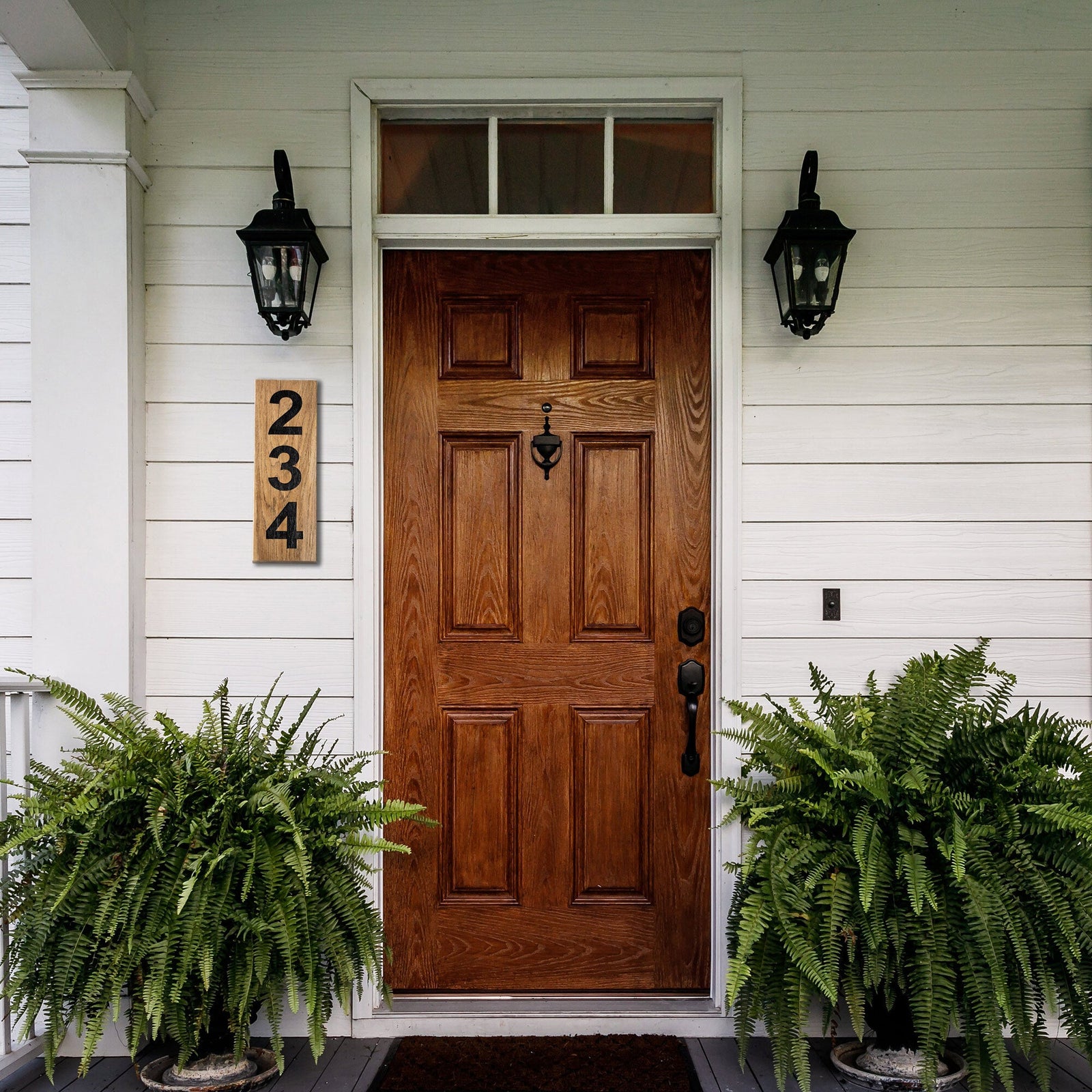 Welcome guests into your home with a custom home address sign handcrafted from a Hickory barrel & Full Grain Leather. Personalize this unique wood sign with your house number. A simple, rustic design, Holtz Leather’s custom House Number Sign is built to withstand the weather and make a statement at your door. Handcrafted in the U.S.A.
