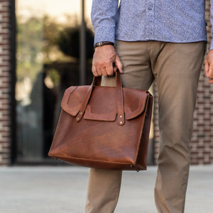 Handcrafted from full grain leather in our Huntsville, AL workshop, this timeless briefcase features a spacious compartment for your laptop or notebook and an interior pocket to keep smaller items neatly tucked away.